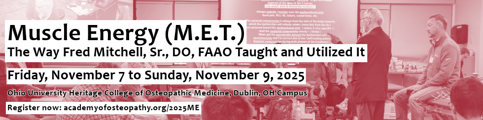 For Patients: Find A DO Physician SearchFind A PhysicianConvocation 2026: Mastering Technique, Precision, and PerceptionMarch 18-22, 2026 in Colorado Springs, CO Registration Now OpenConvo 2026 Exhibit Booths & SponsorshipsIn-person CME 2025 & 2026 | On-Demand CME | Affiliate CMEAmerican Academy of OsteopathyLeaders in Osteopathic Manipulative MedicineThe American Academy of Osteopathy is an osteopathic medical society with a focused educational mission. Founded in 1937, the AAO was established to teach, advocate and research the science, art and philosophy of osteopathic medicine, emphasizing the integration of osteopathic principles, practices and manipulative treatment in patient care. Join TodayWhat is an Osteopathic Physician?Osteopathic physicians (DOs) attend fully licensed medical schools just like MDs, but in addition to the standard medical curriculum, DOs learn how to approach patients differently, treating the whole person rather than the symptoms. In addition, some DOs specialize in osteopathic manipulative treatment (OMT), using their hands to diagnose, treat and prevent illness or injury. Using OMT, they will move your muscles and joints with a variety of techniques, including stretching, gentle pressure and resistance. Osteopathy FAQOMM and ONMM Specialty |